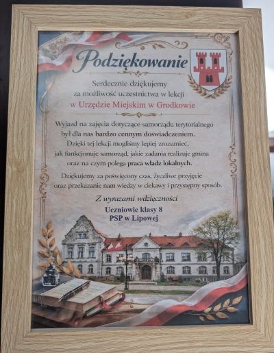 Na ręce Sekretarza gminy zostały złożone piękne podziękowania za poświęcony czas i przekazaną wiedzę. Takie spotkania pokazują, jak ważna jest edukacja obywatelska i budowanie świadomości młodego pokolenia.